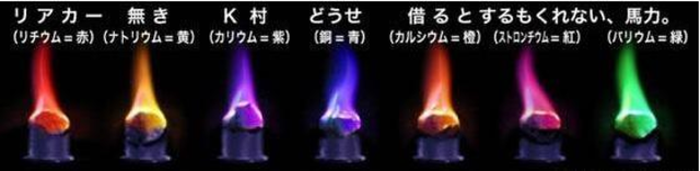 『リアカー無きK村動力借ろうとするもくれない馬力。』 (Li赤) (Na黄)(K紫)(Cu緑)(Ca橙)(Sr紅)(Ba緑)