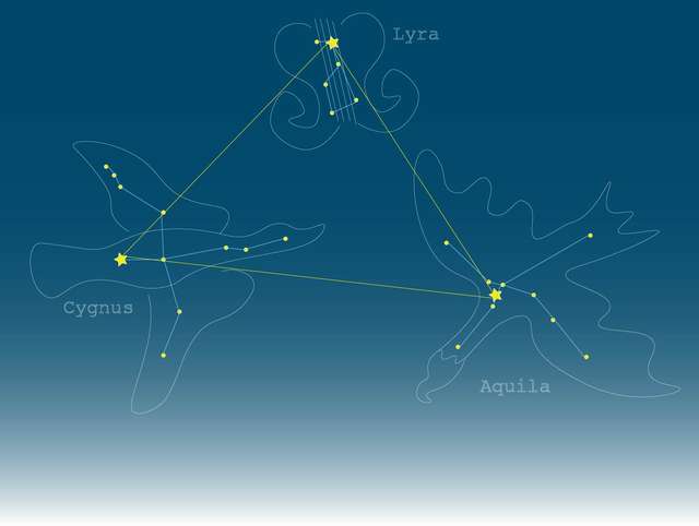 夏の大三角形をなす3つの星、ベガ・アルタイル・デネブ。ベガは織姫(おりひめ)として、アルタイルは彦星(ひこぼし)として知られています。