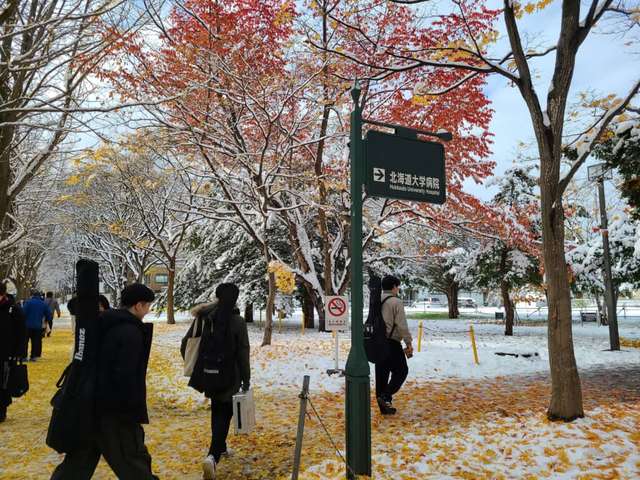 「秋と冬が同時に来る大学、北海道大学」というコメントを添え、構内の一角にある雪をかぶった赤や黄色の紅葉を収めた写真をアップしました。