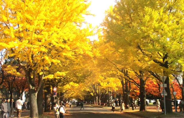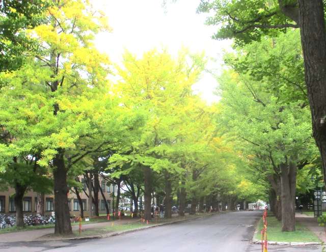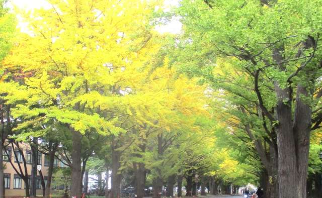 イチョウは北13条門から西に続く約380メートルの道の両脇に計70本植えられ、ポプラ並木と並ぶ北大の観光名所になっている。