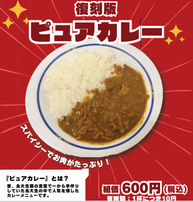 その一環として、北大創基150周年を記念する特別メニュー「 復刻版ピュアカレー」が、10月20日(月)〜24日(金)まで、北大生協食堂で販売されます。
