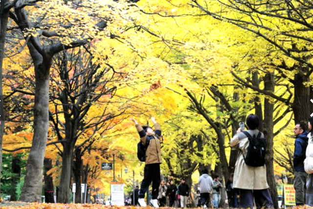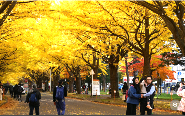 北海道大(札幌市北区)構内のイチョウ並木が見ごろを迎え、訪れた市民や観光客が黄金色に色づくアーチを楽しんでいる。