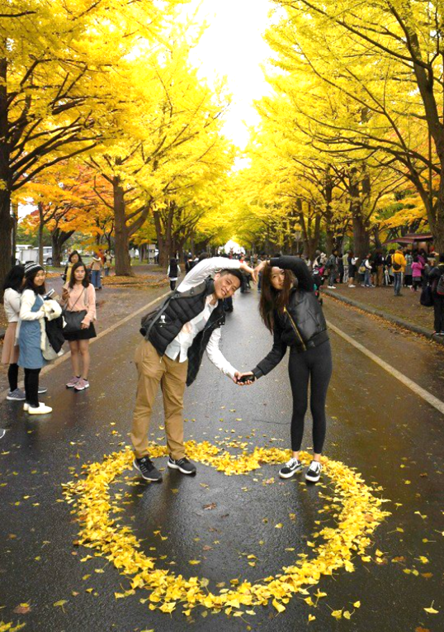 黄金色のアーチに笑顔 北大イチョウ並木見ごろ 外国人観光客の姿も
