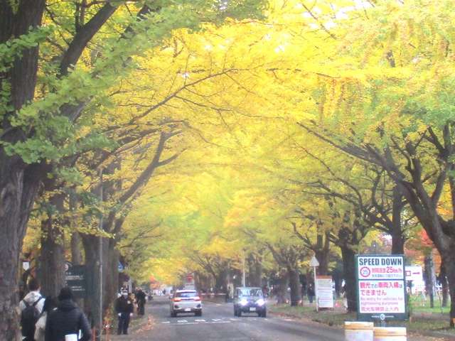 札幌市北区の北海道大学の構内にあるイチョウ並木が見ごろを迎えている。約380メートルの間に植えられた70本のイチョウが黄色いトンネルのような光景を作り出している。