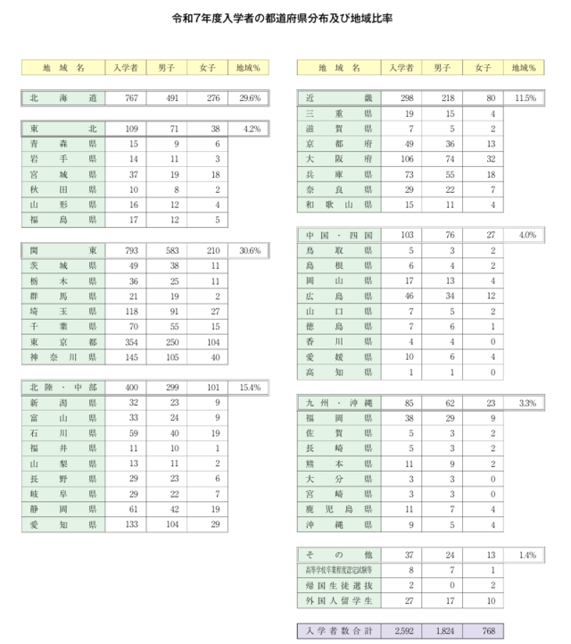 【北大時報】令和7年度入学者の都道府県分布及び地域比率