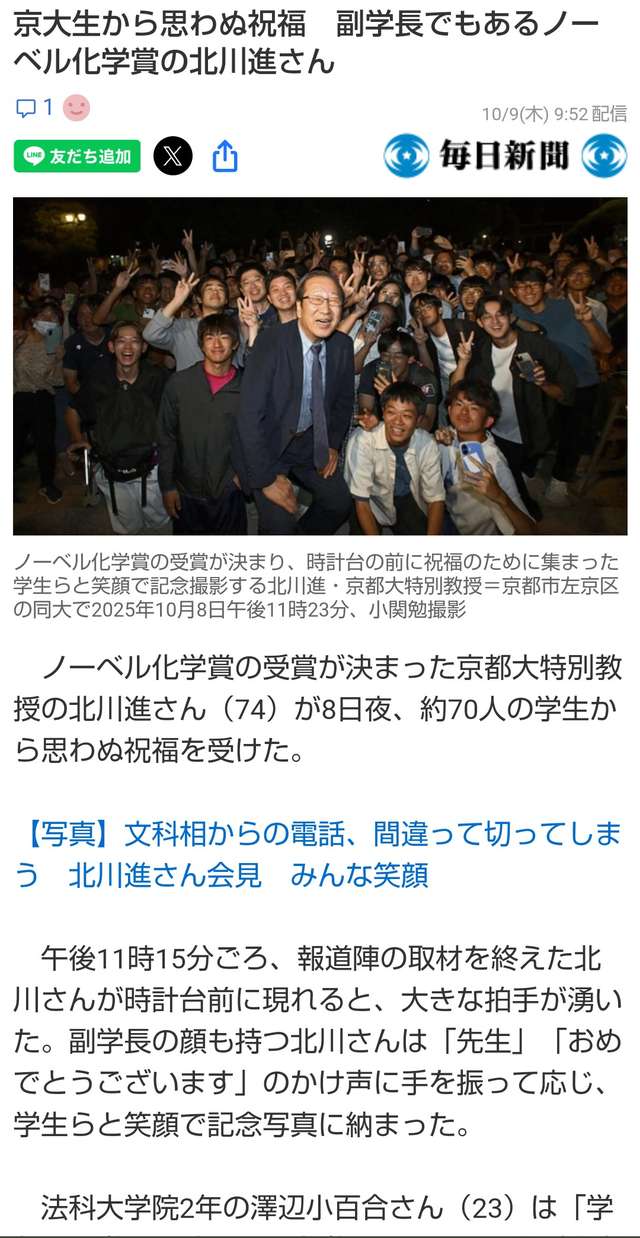 ノーベル化学賞受賞の北川さんが学生から祝福、揮毫(きごう) [写真特集4/10] | 毎日新聞