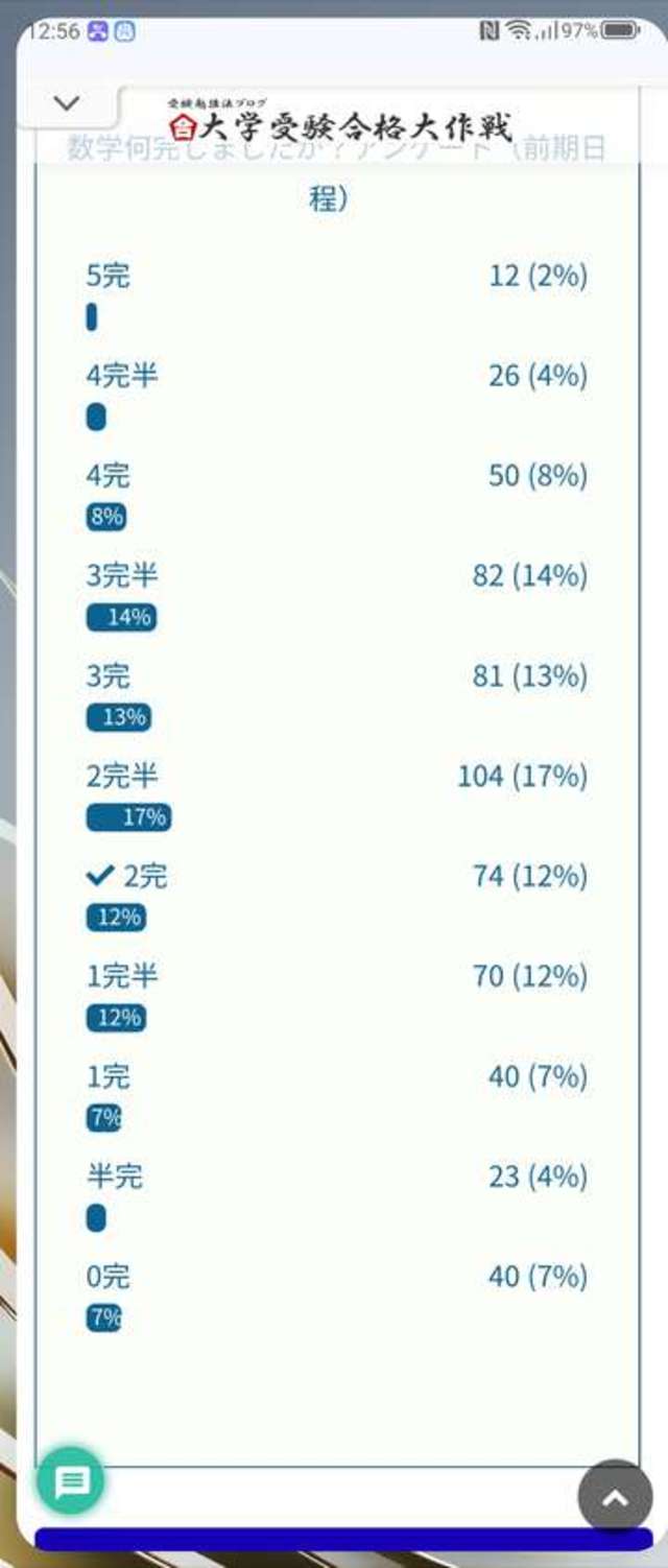 ※昨年のアンケートより1完分分布図が上がっています。昨年は2完付近、今年は3完以上が大半占めますね。昨年は前のスレッドで見れます。