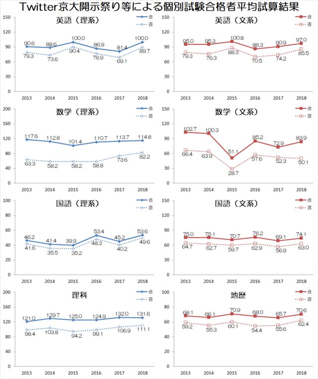 各教科の合格者、不合格者平均の推移をグラフ化してみたよ