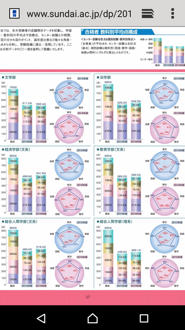 2015年と2016年の合格者、不合格者の開示平均各学部毎に別れている。
