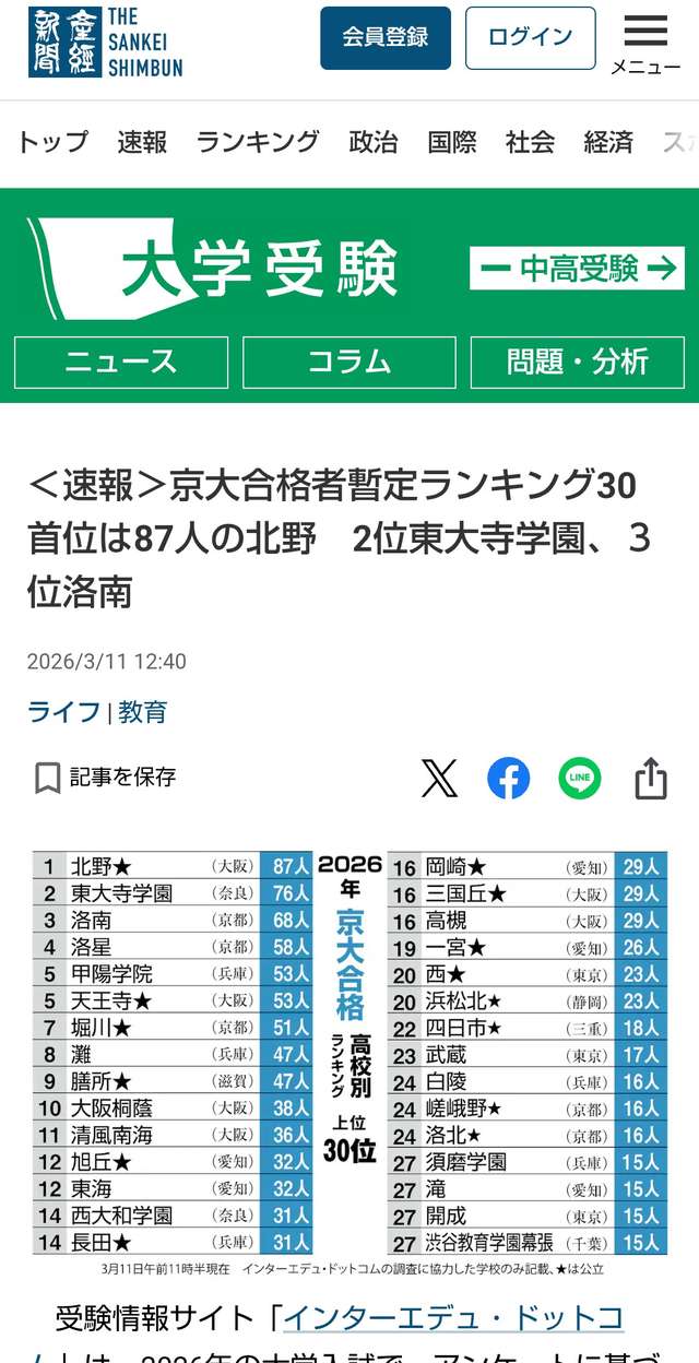 <速報>京大合格者暫定ランキング30 首位は87人の北野 2位東大寺学園、3位洛南 - 産経ニュース