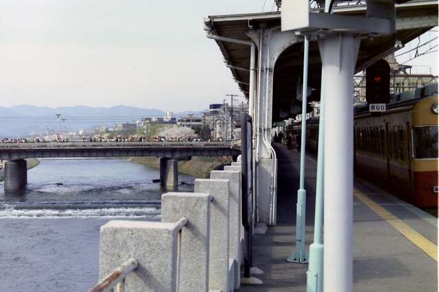 桜も見える三条駅のホームで、折り返しの特急の先頭車両に乗ろうとして
