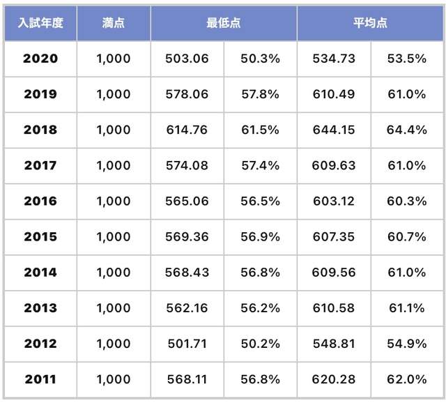 京都大学各学部合格最低点(2011〜2020) 河合塾