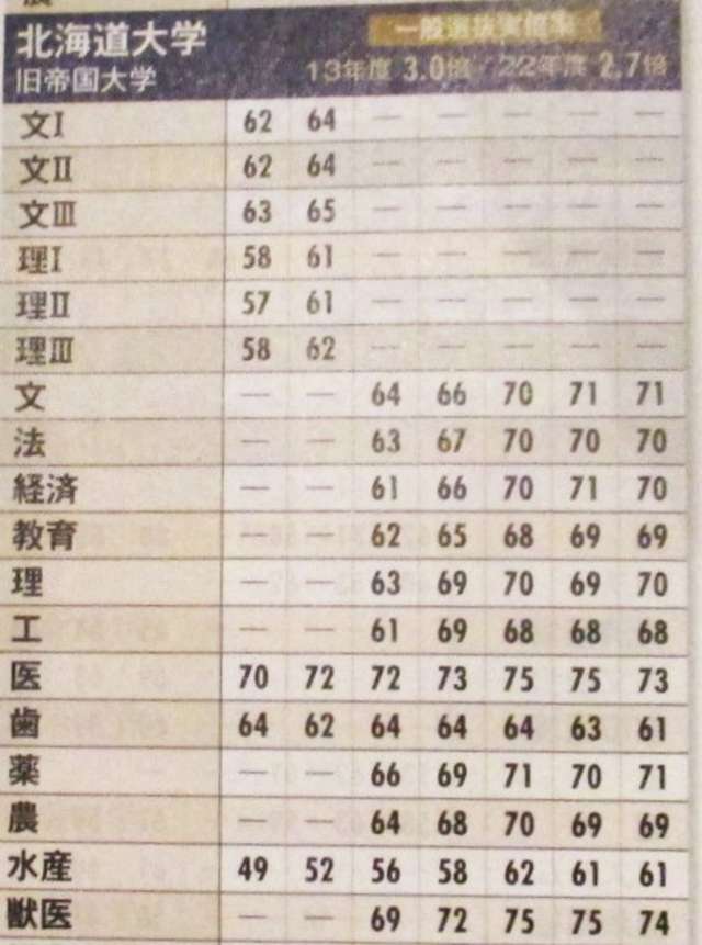 かつて、旧帝大最底辺だった北大水産学部は、偏差値49から61となり、九大理学部・農学部と並んだ。