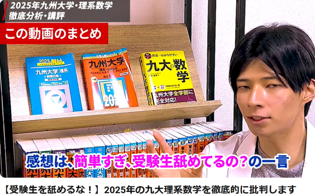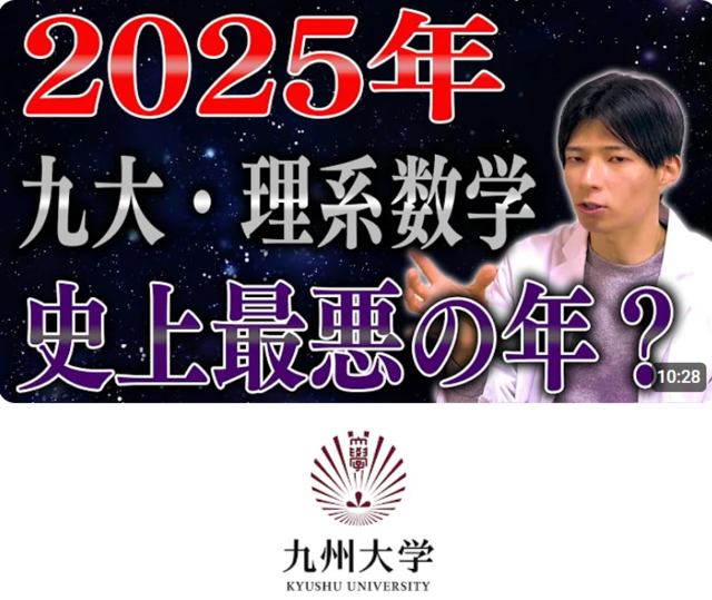 九大の理系数学は、22年、23年は難化し、24年は易化した。25年は反動で難化すると予想されたが、思い切り易化した。26年はどうなるか分からない。