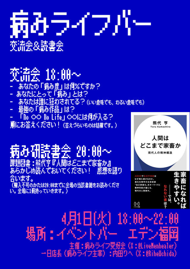 病みライフ愛好会主催・病みライフバーをエデン福岡でやります! 初回病み研読書会は熊代亨『人間はどこまで家畜か』を読みます! 福岡のみなさま、ぜひご参加ください! 当日はDiscordサーバー上での中継も予定しています!