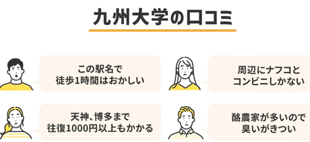 ほかにも、学生に起業させて自分の実績を作る紛い物講師や就活支援と称して不本意な接触を繰り返すなど、九大生の純朴さ・真面目さを利用する話をよく耳にします、気を付けて良き思い出となる学生生活を送ってください。