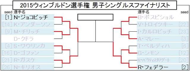 ボトムハーフからはBIG4対決を制したロジャー・フェデラー[2]がA・マレーを降し決勝進出を決めました。マレー戦ではリターンが得意なマレーにほとんど有効的な攻撃をさせないサービスゲームを展開、マレーの弱点と言われる精神面を攻め各セット終盤のプレッシャーのかかるゲームでブレークに成功していました。2012年のウィンブルドン以来のグランドスラム制覇、ウィンブルドン単独最多優勝記録となる8回目の優勝を争います。